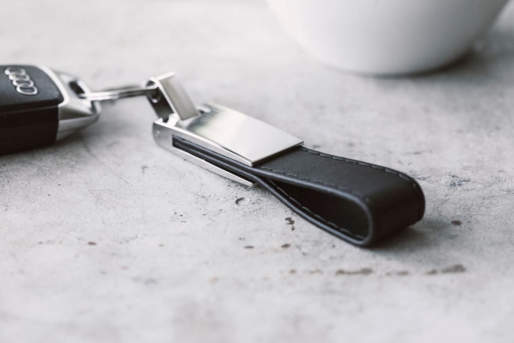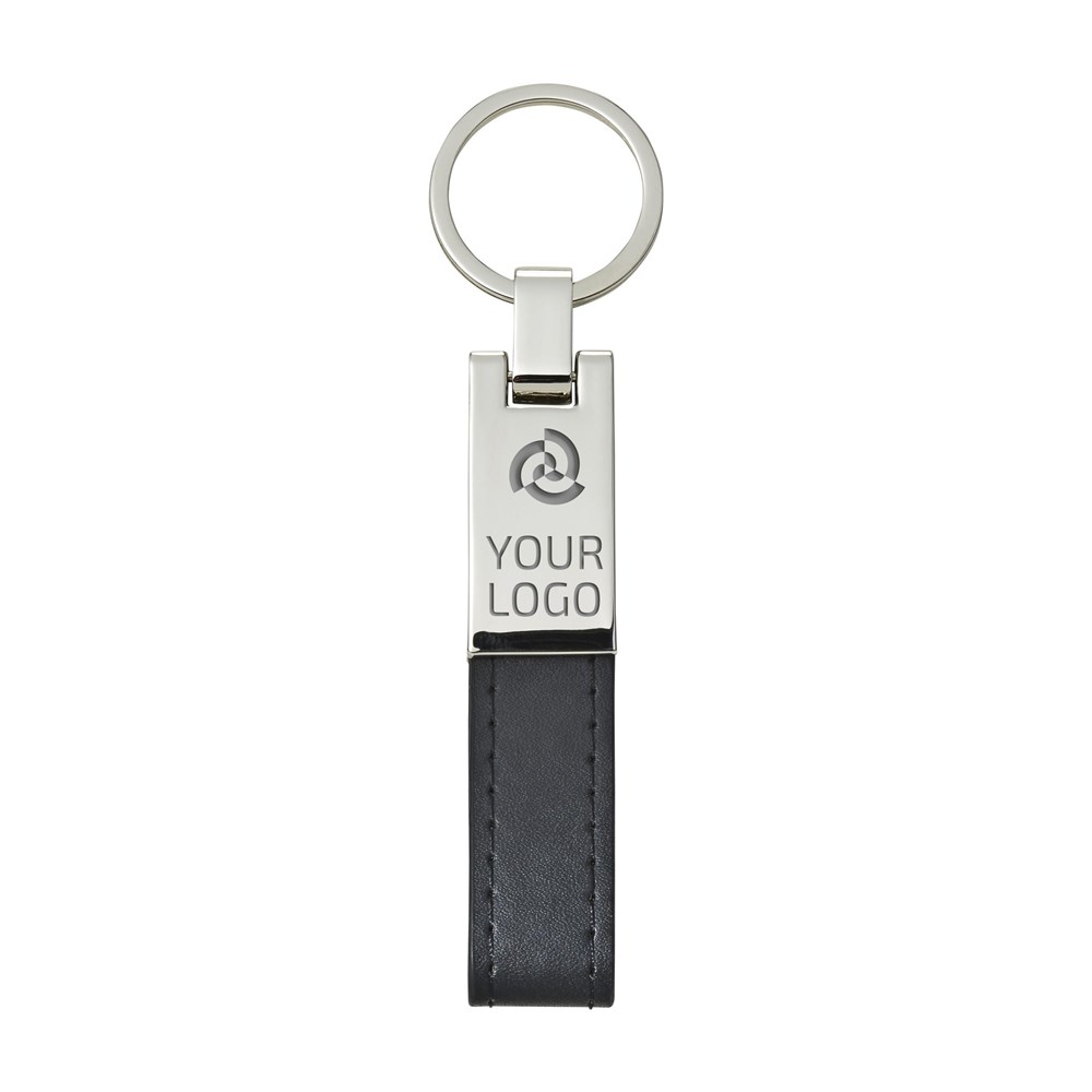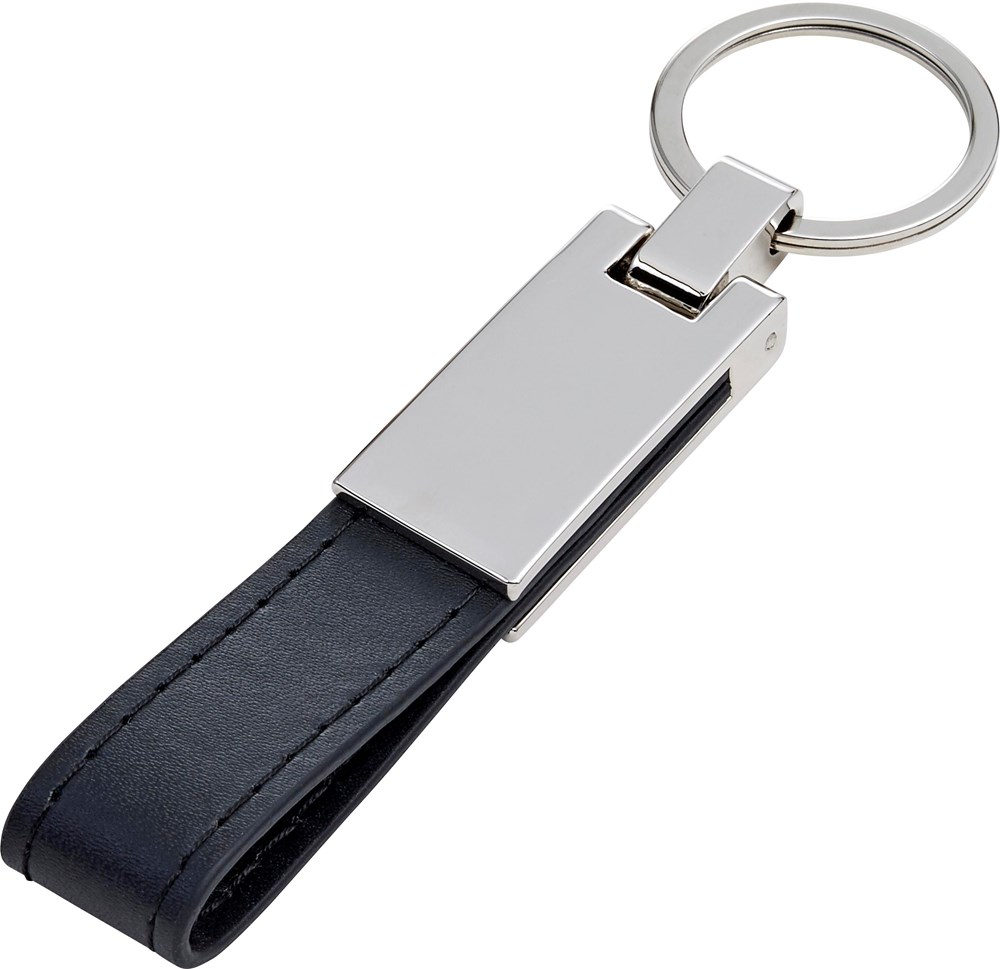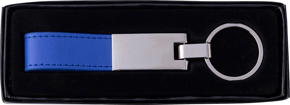 Schlüsselanhänger mit einer silberfarbenen Platte aus Stahl und einer Lasche aus PU Kunststoff. Verpackt in einer schwarzen Geschenkbox.