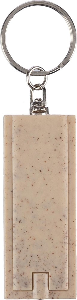 Weizenstroh-Schlüsselhalter mit LED-Licht, Metallring und Druckknopf. Einzelnes LED-Licht. Einzeln verpackt in einem recycelten Polybeutel.