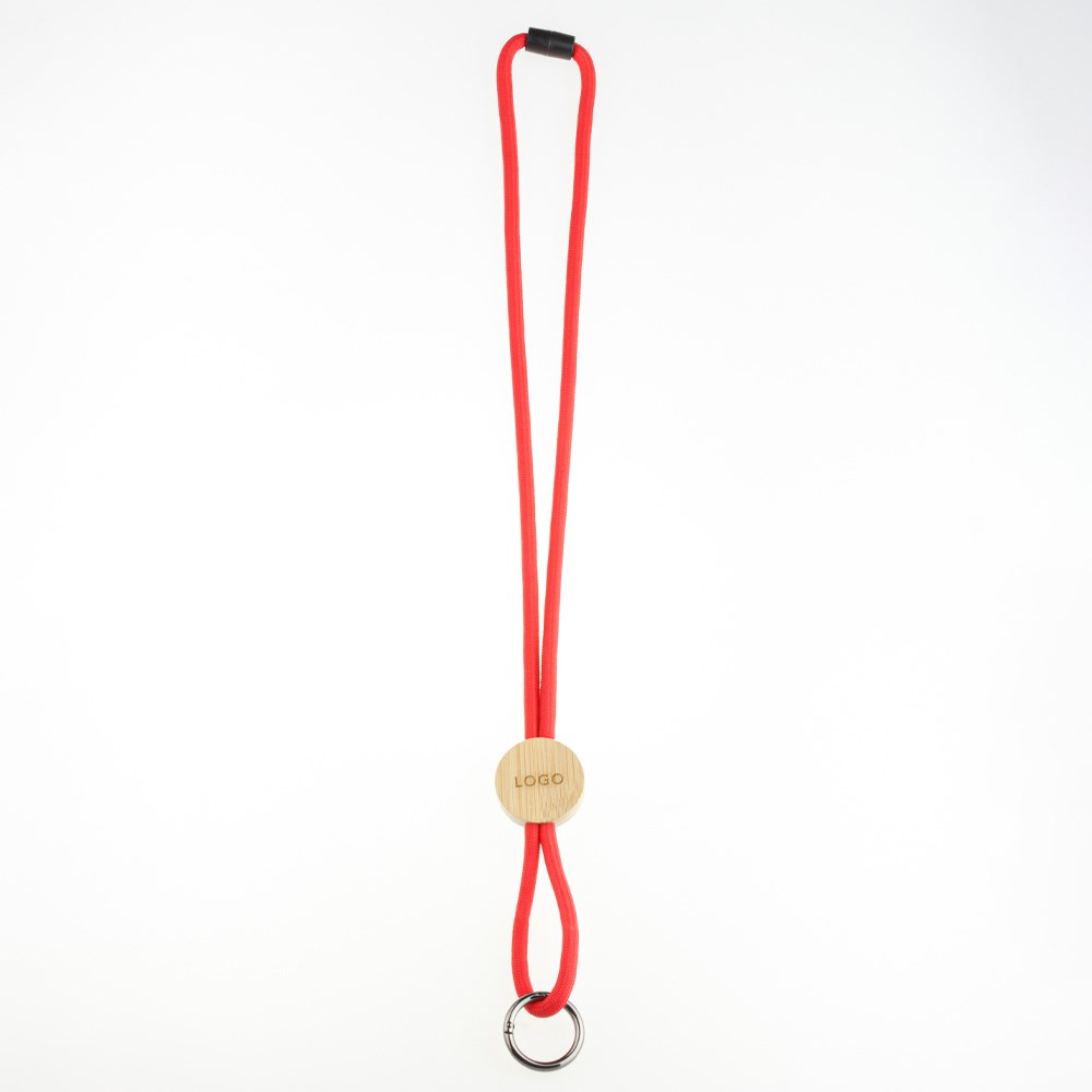 Nachhaltiges Lanyard aus recyceltem PET mit Bambus-Slider. Ideal für Events und Werbeaktionen. Gravurfähiger Holz-Slider und Schlüsselring aus Metall. In vier Farben verfügbar oder individuell nach PANTONE®.