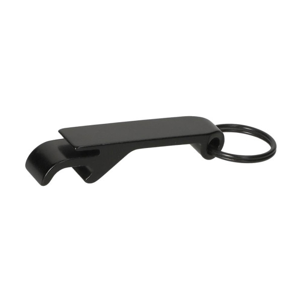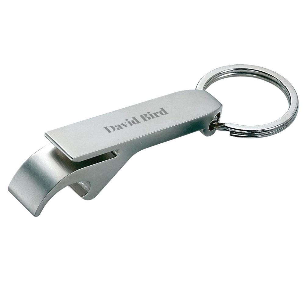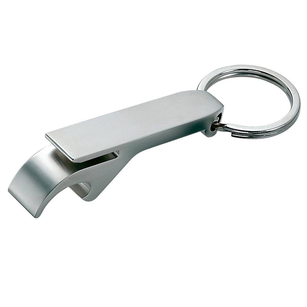Anhänger mit Schlüsselring und Öffner für Flaschen und Getränkedosen in Einem. Gefertigt aus matt poliertem Metall.