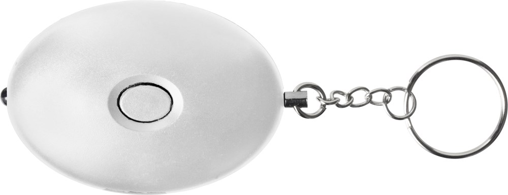 Alarmknopf aus ABS Kunststoff mit Schlüsselkette und -ring. Das LED Licht wird durch Drücken des Knopfs ausgelöst. Durch das Ziehen am Stift wird der Signalton ausgelöst.