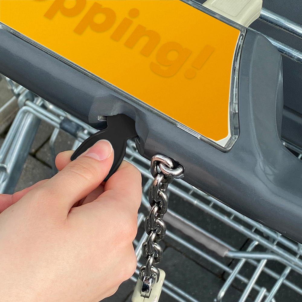 mit Gliederkette nach Auslösen des Einkaufswagens herausziehbar